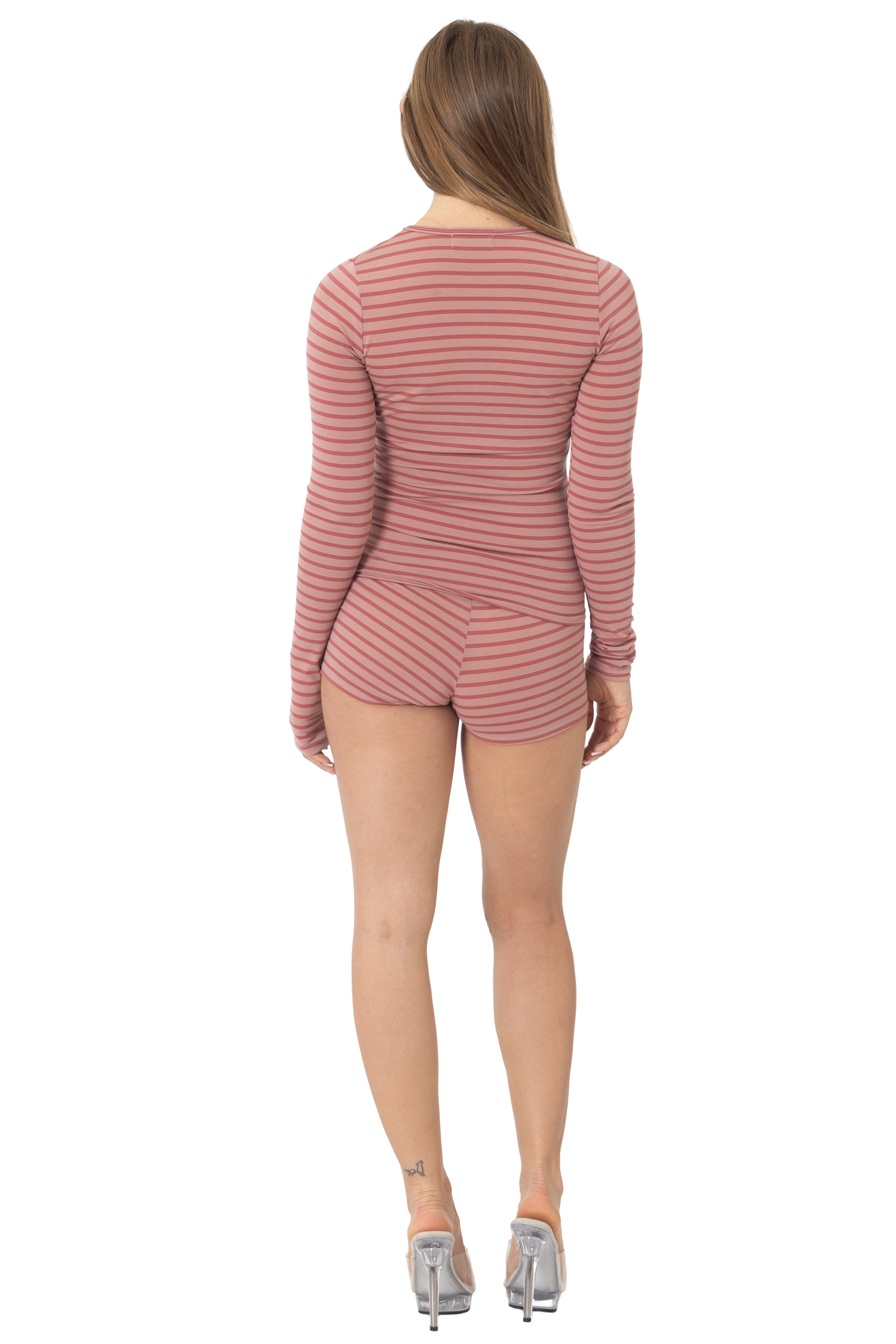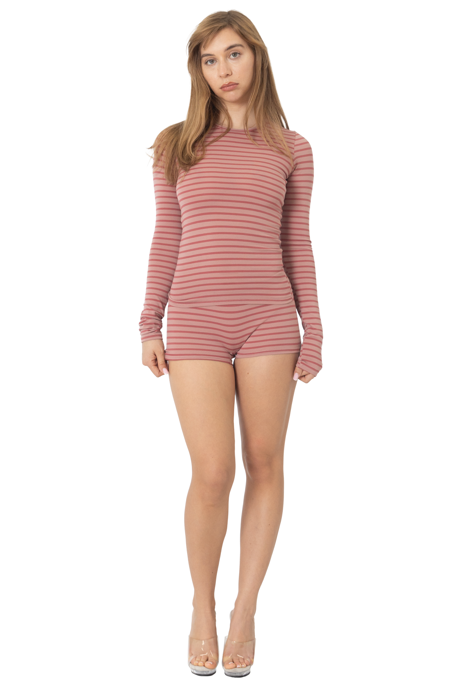 Soft, stretchy, and made to move. The Hottie Short in Pinky are crafted from our cotton–spandex blend with a breathable feel and flexible fit. The muted rose stripe keeps it classic, while the silhouette stays sleek and simple. Perfect for lounging, layering, or stepping out with low–key edge. Pair with our Scene Long Sleeve in Pinky to complete the look.