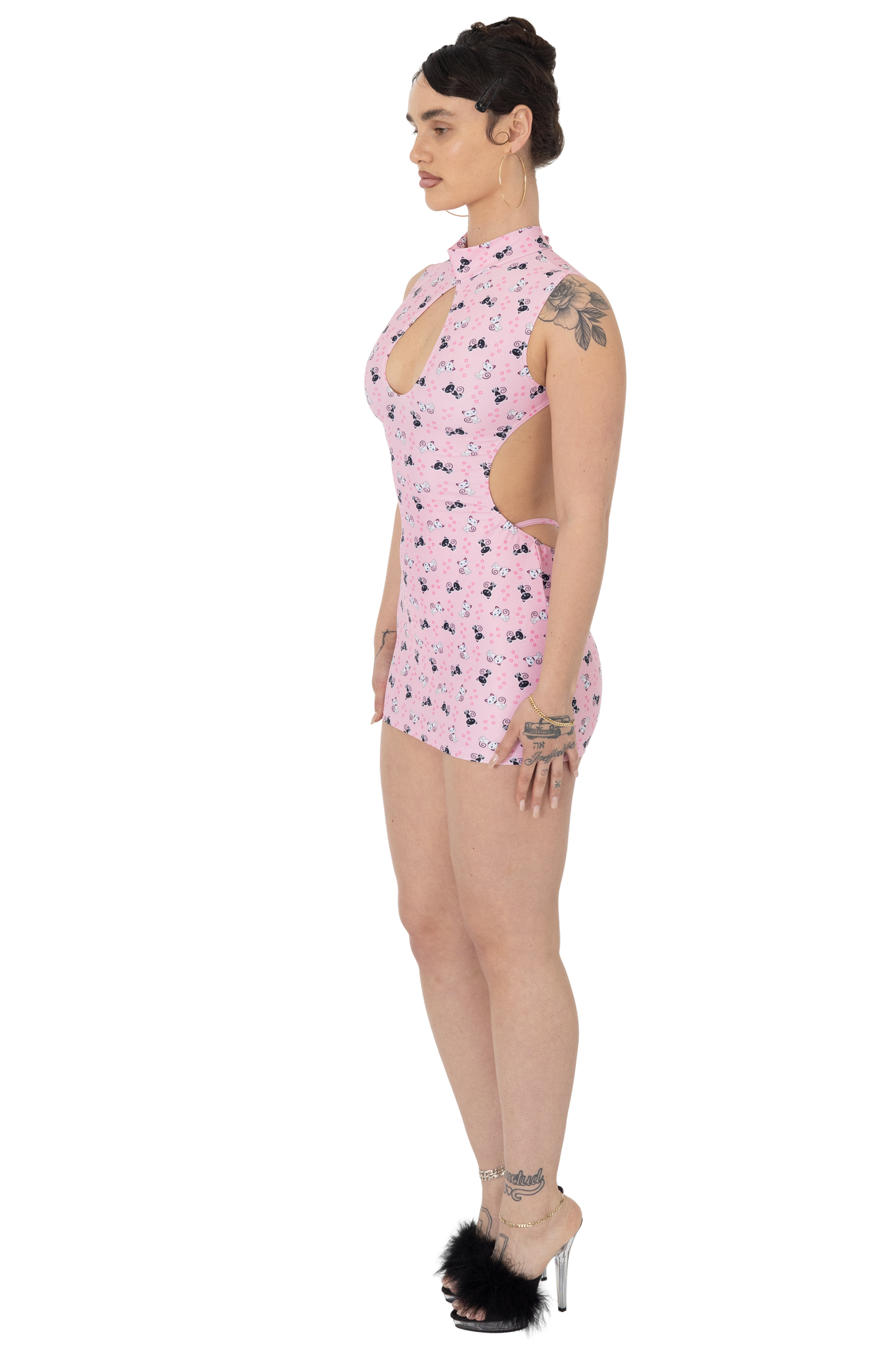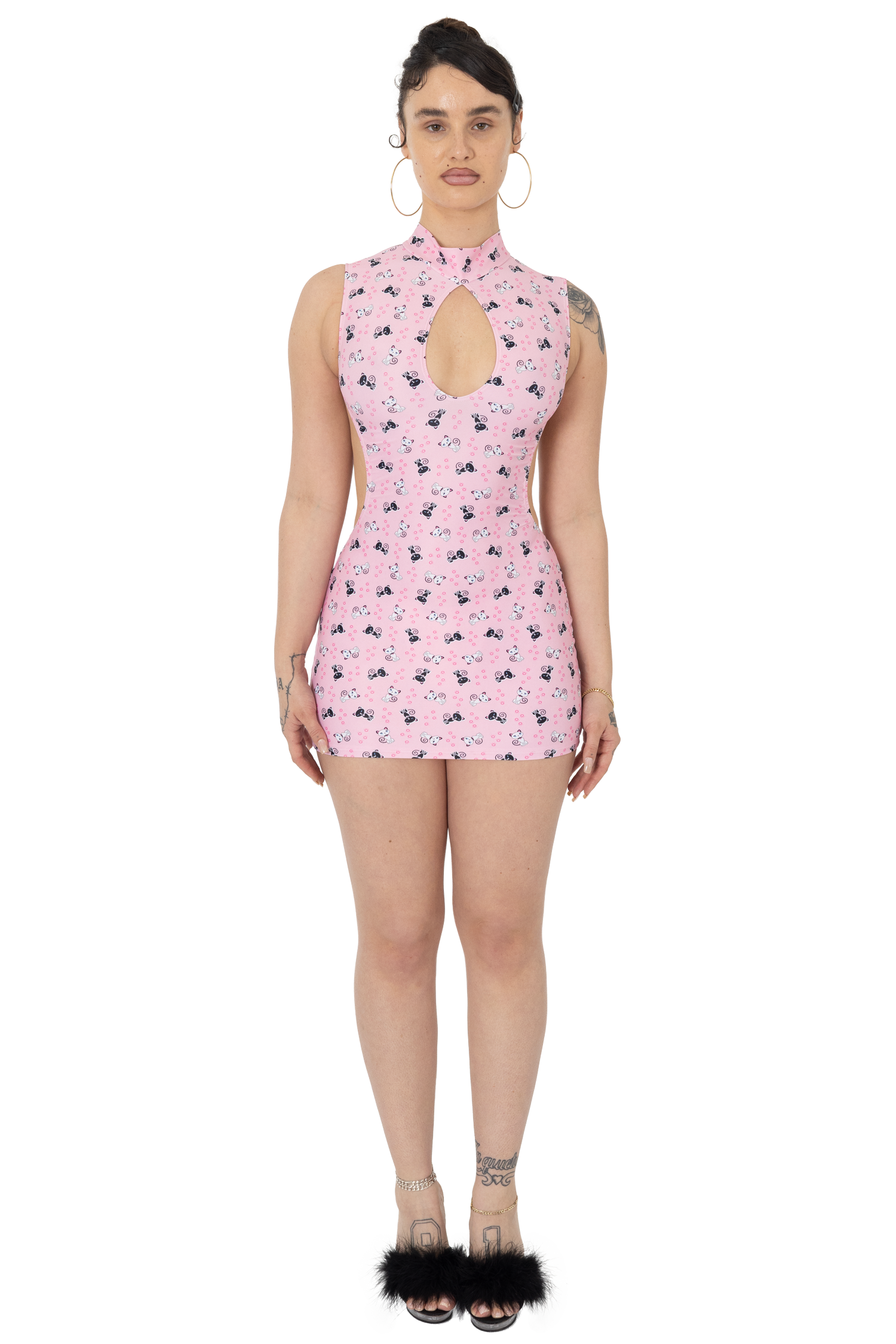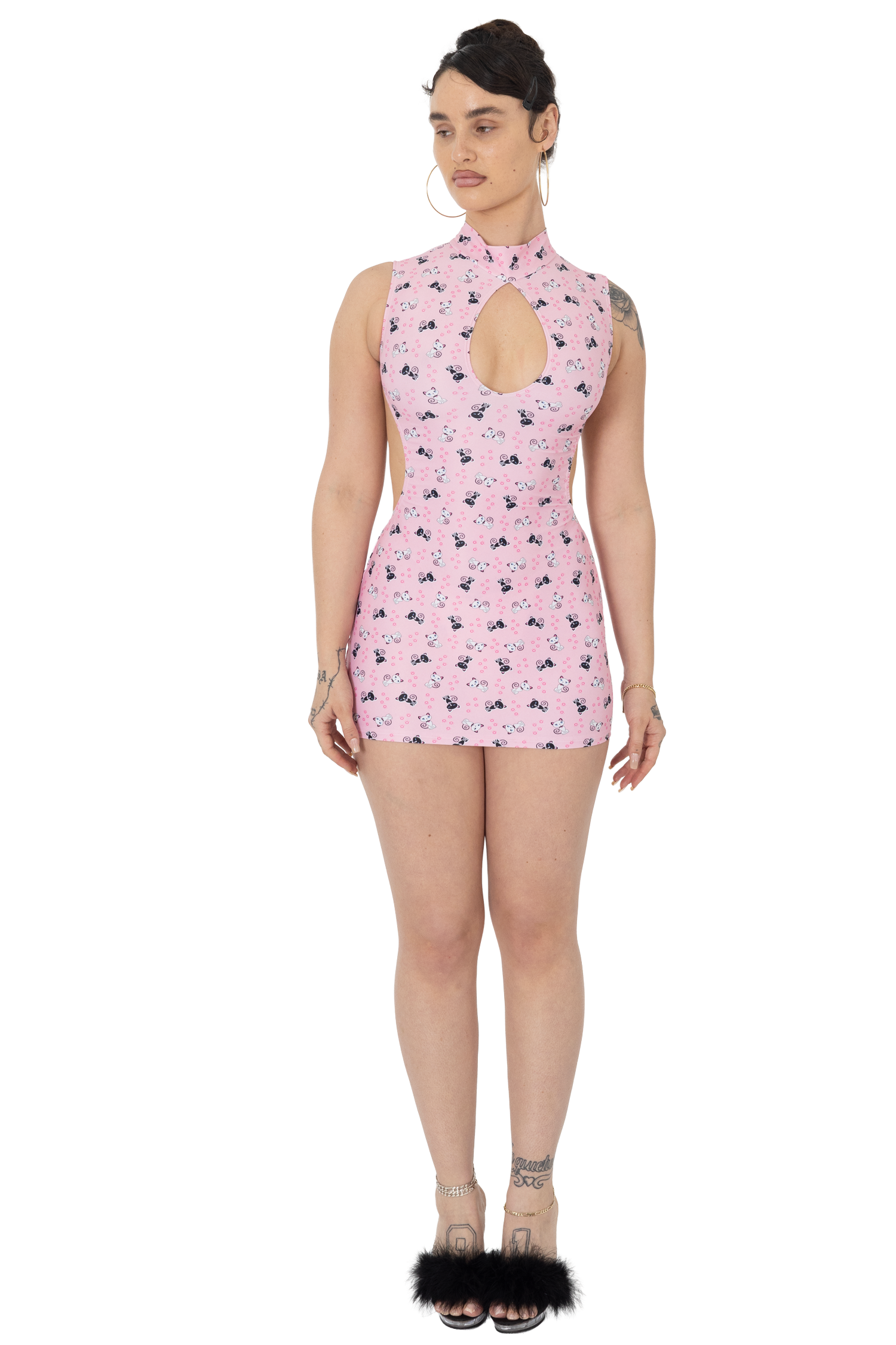 Our Keyhole Dress in Pink City Kitty, sweet but not to be messed with. Cut from our soft stretch fabric, it hugs the body with a playful, ultra-mini silhouette. The print features our City Kitty motif that adds a flirty and playful twist. The high mock neckline is balanced by a sharp front keyhole cutout, while in the back, a clean low rise open cut. Creating a striking silhouette. Perfect for nights out, afterparty selfies, or just causing a scene.