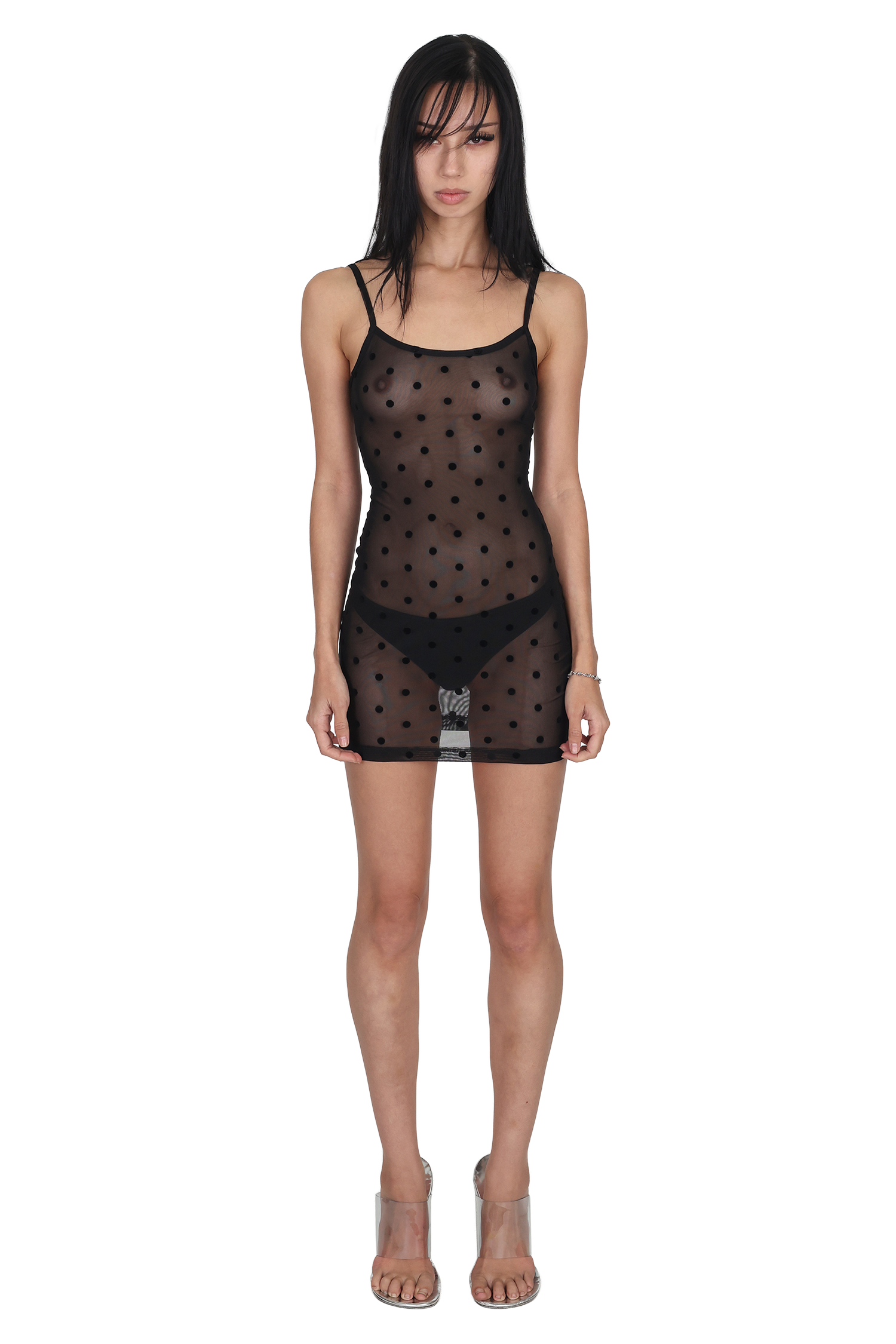 The Minnie Dress in Mini Dots showcases a sleek, body-hugging silhouette with delicate spaghetti straps and an all-over flocked polka dot design. Crafted from sheer micro mesh made of stretchy and durable nylon-spandex, this dress effortlessly combines bold transparency with timeless elegance.
