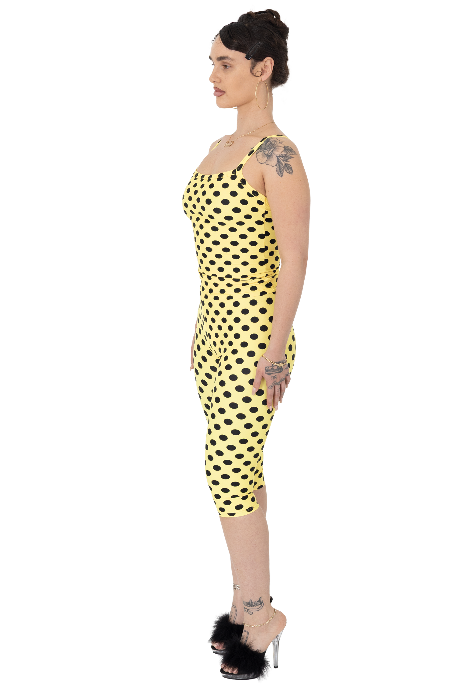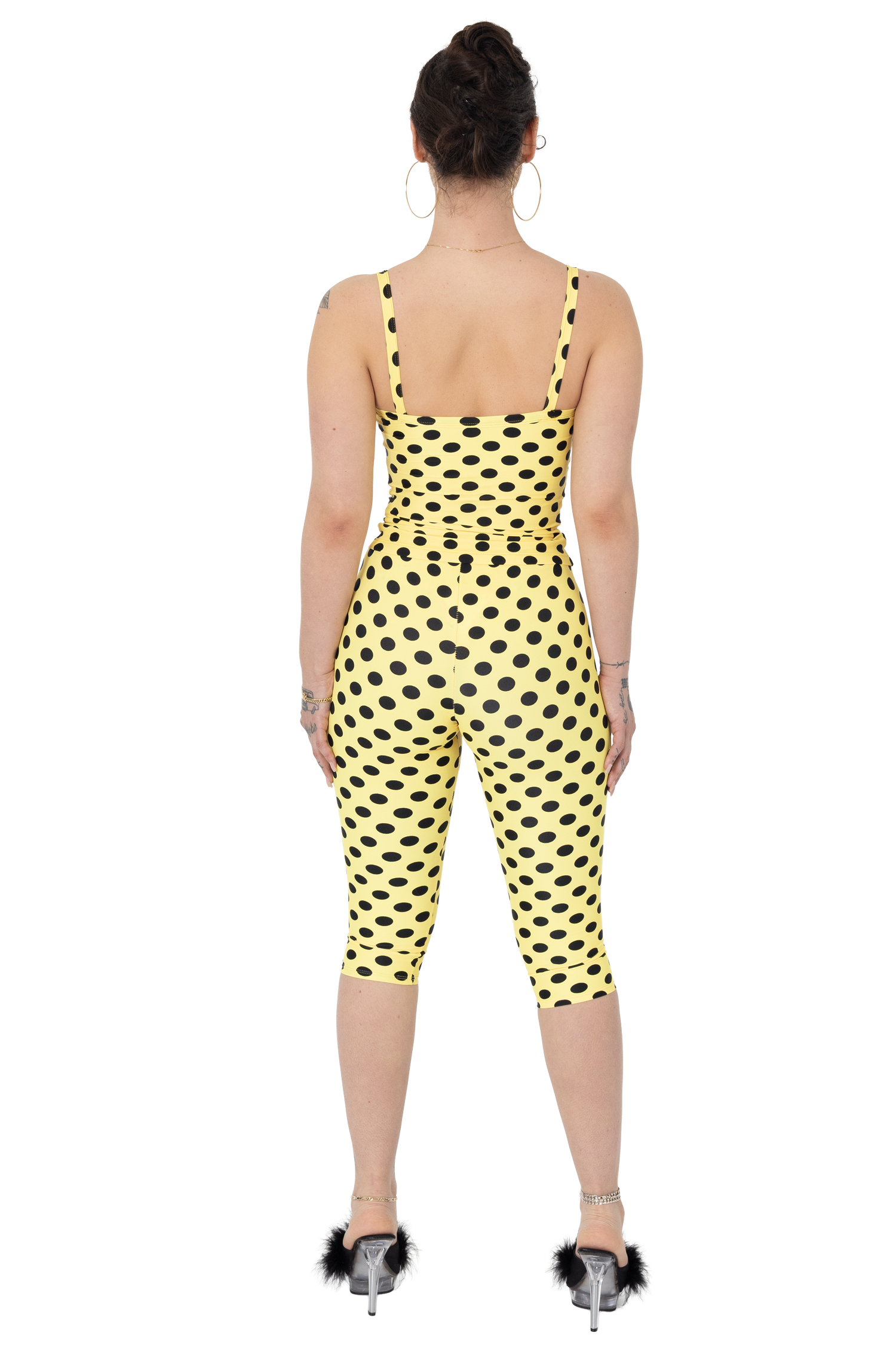 Introducing the Muse Camisole in Dante. This sleek camisole features vibrant yellow polka dot detailing, slim spaghetti straps, and a flattering fitted silhouette, making it a versatile choice for any occasion. Effortlessly transition from day to night with this essential wardrobe piece. A perfect blend of playful style and functionality, it pairs beautifully with our Roma Capris for a bold, polished look.