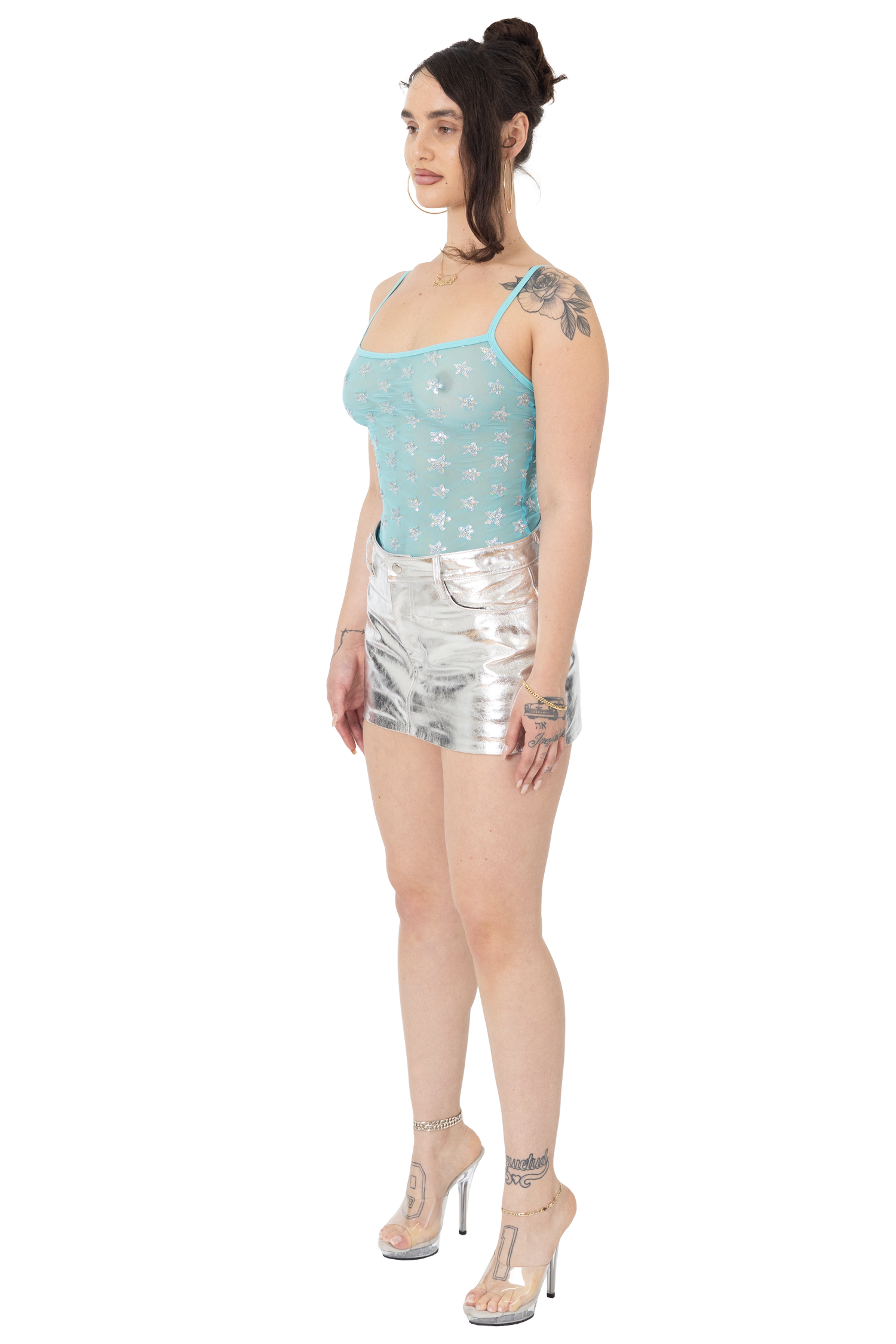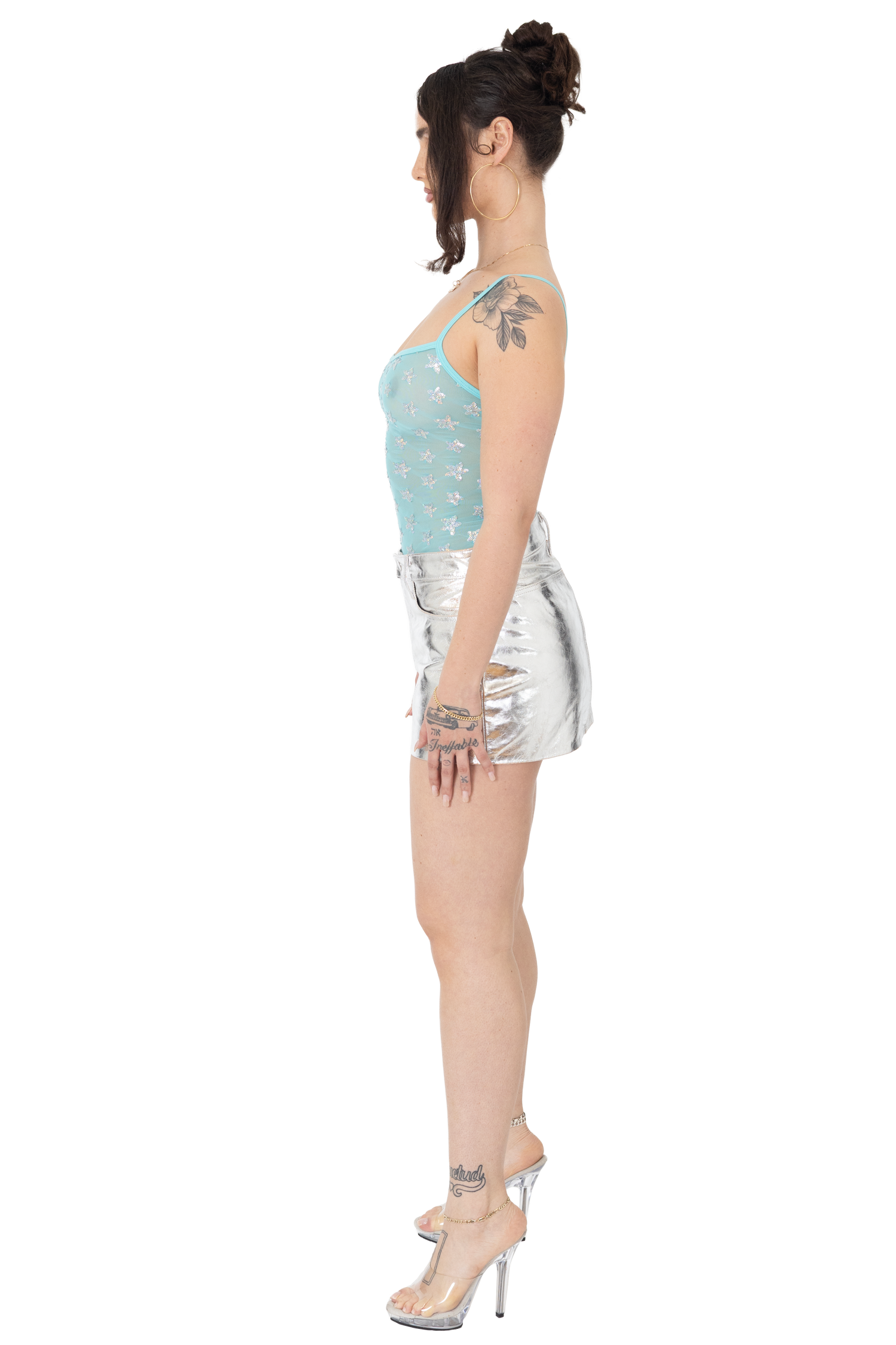 The Muse Camisole in Platinum Star is a dazzling wardrobe essential. Crafted from sculpting micro mesh for a flattering fit, it features custom star sequins that add a touch of brilliance. With slim straps and a streamlined silhouette, this camisole is perfect for layering or wearing on its own for a chic, standout look. Pair it with our Vixen Leather Skirt for a bold ensemble. Made from deadstock fabric, this garment helps reduce waste.